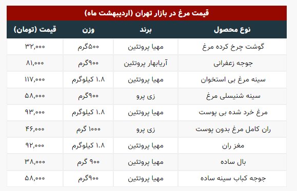 قیمت روز مرغ در سطح بازار تهران برای اردیبهشت ماه اعلام شد.