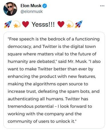 به گفته توییتر، ایلان ماسک، بنیانگذار اسپیس ایکس و تسلا، توییتر را به قیمت ۴۴ میلیارد دلار خریداری می کند.