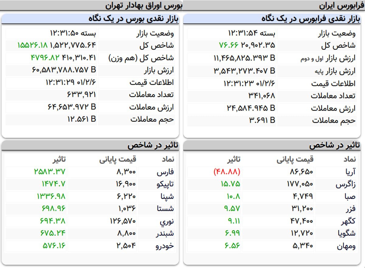 در این بازار هم امروز بیشترین اثر مثبت بر شاخص فرابورس به نام نمادهای معاملاتی پتروشیمی زاگرس، سرمایهگذاری صبا تامین و پویا زرکان آق دره شد و در مقابل شرکتهای پلیمر آریا ساسول، توسعه مسیر برق گیلان و فرآوردههای غذایی قند چهارمحال بیشترین اثر منفی را بر این شاخص به نام خود ثبت کردند.