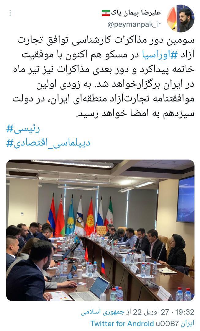 به گزارش سایت طلا،علیرضا پیمان پاک رئیس سازمان توسعه تجارت در توئیتی نوشت: سومین دور مذاکرات کارشناسی توافق تجارت آزاد اوراسیا در مسکو هم اکنون با موفقیت خاتمه پیداکرد و دور بعدی مذاکرات نیز تیر ماه در ایران برگزارخواهد شد. به زودی اولین موافقتنامه تجارتآزاد منطقهای ایران، در دولت سیزدهم به امضا خواهد رسید.