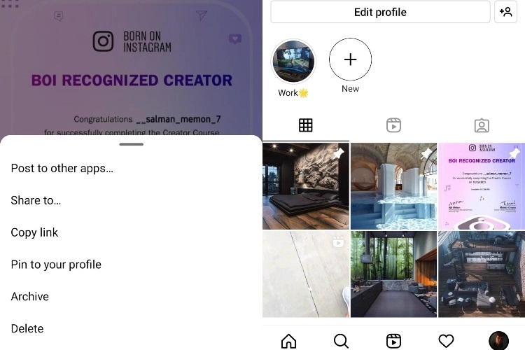 اینستاگرام در حال بررسی ویژگی جدیدی است که به کاربران اجازه میدهد پستهای خاصی را در بالای پستهای خود پین کنند. این ویژگی در حال حاضر بصورت آزمایشی برای برخی کاربران منتخب ارائه شده است. کاربرانی که به این ویژگی دسترسی دارند، با انتخاب منوی سه نقطه در کنار پست ها، گزینه "Pin to your profile" را مشاهده خواهند کرد.
