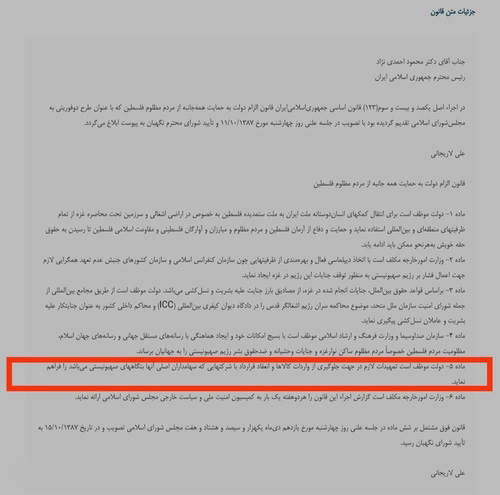 ماده ۵_دولت موظف است تمهیدات لازم در جهت جلوگیری از واردات کالاها و انعقاد قرارداد با شرکتهایی که سهامداران اصلی آنها بنگاههای صهیونیستی است را فراهم نماید.
