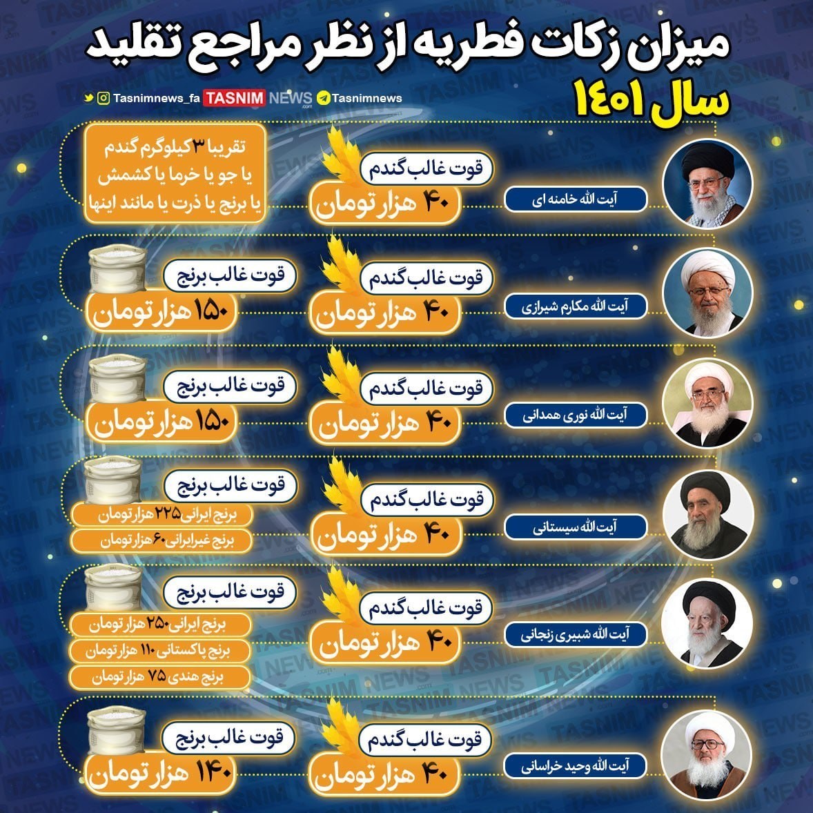 ضمناً زکات فطره امسال (1401) بهقیمت گندم برای هر نفر، «چهل هزار تومان » اعلام شده است.