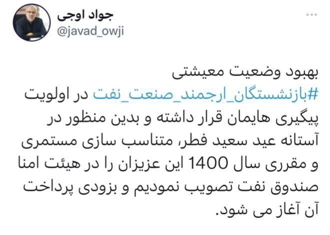 به گزارش سایت طلا ، جواد اوجی، وزیر نفت در صفحه شخصی خود در فضای مجازی نوشت: بهبود وضعیت معیشتی بازنشستگان ارجمند صنعت نفت در اولویت پیگیریهایمان قرار داشته و بدینمنظور در آستانه عید سعید فطر، متناسبسازی مستمری و مقرری سال 1400 این عزیزان را در هیئت امنای صندوق نفت تصویب نمودیم و بهزودی پرداخت آن آغاز میشود.