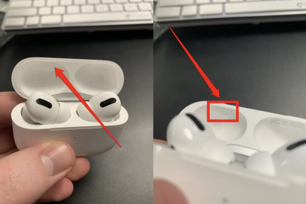 در روش دوم نیز میتوانید شماره سریال را از داخل کیس این محصول پیدا کنید. در کیس ایرپاد مکس، شماره سریال در زیر بالشتک گوشی چپ نوشته شده است. البته شماره سریال بسیار ریز نوشته شده و شاید به یک ذرهبین نیاز داشته باشید.