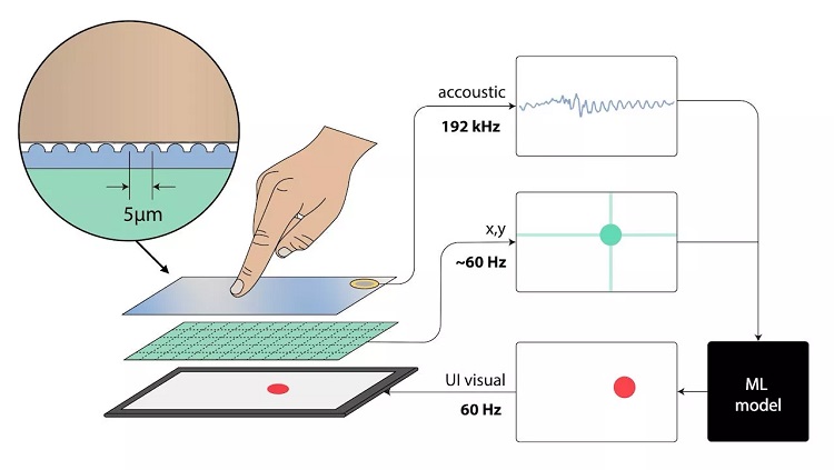 میکروفونها نمیتوانند از روی ارتعاشات تشخیص دهند که انگشت یا قلم کدام قسمت صفحه لمسی را لمس کرده است. آنها از دادههای صوتی همراه با دادههای موقعیت دقیق تری که توسط خود صفحه لمسی خازنی گرفته شده است برای ایجاد یک مدل یادگیری ماشینی و به منظور پیش بینی این موضوع استفاده میکنند. این روش همیش %۱۰۰ دقیق نیست، اما به اندازهای دقیق است که دستگاههای صفحه لمسی را بسیار پاسخگوتر و واکنش پذیرتر میکند و تاخیر را به ۱۶ میلی ثانیه و خطای فاصله را به حدود پنج میلی متر میرساند. کاربر هنگام استفاده از یک دستگاه لمسی با استفاده از این فناوری، سرعت بیشتری را به ویژه در هنگام یادداشت برداری احساس خواهد کرد.
