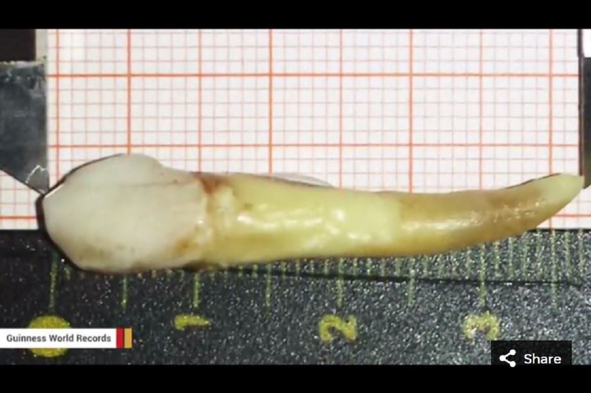 دکتر مکس لوکاس اهل آلمان این دندان غول پیکر ۳.۷۰ سانتی متری را کشیده و نامش را به عنوان فردی که بزرگترین دندان جهان را کشیده در کتاب رکوردهای گینس به ثبت رسانده است.