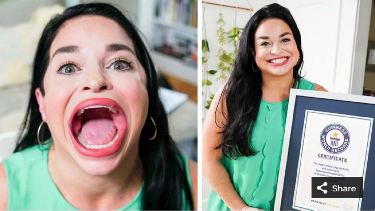 سامانتا رمزدل که عرض دهانش ۶.۳۵ است، رکورد گشادترین دهان یک زن در جهان را شکسته است.