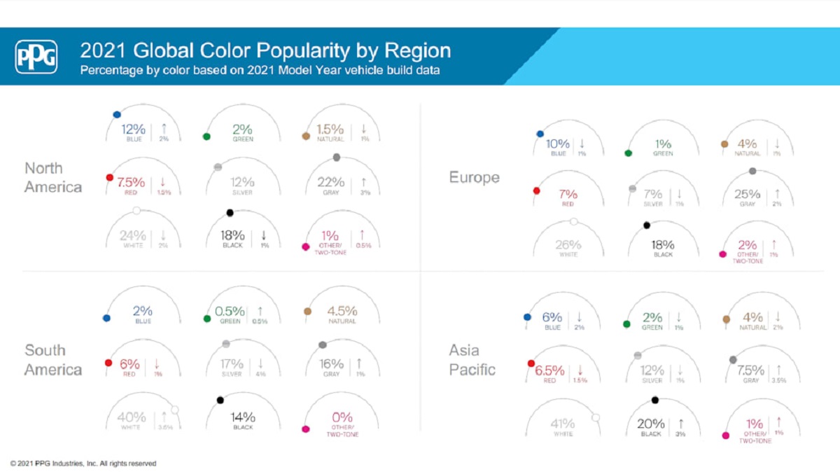 مشخصاً آمریکای شمالی از بقیه جاهای دنیا رنگارنگ تر است. خریداران آمریکایی نسبت به همتایان خود در آمریکای جنوبی، آسیا یا اروپا بیشتر نسبت به خرید خودروهای با رنگ های متفاوت راغب بوده اند. در قاره هایی که ذکر شد، خریداران رنگ سفید را ترجیح می دهند. اما نمی توان از سیر و روند موجود چشم پوشی کرد. اگرچه محبوبیت رنگ مشکی ثبات پیدا کرده است، اما سفید و طوسی روند رو به افزایش دارند.