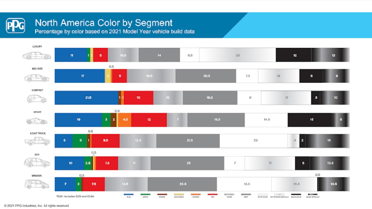 خریداران آمریکایی ماشین میان رده ی «سدان» همچنان به آبی علاقه مند هستند و رنگ قهوه ای نیز در میان خریداران خودروهای اسپرت محبوبیتش را حفظ کرده است.