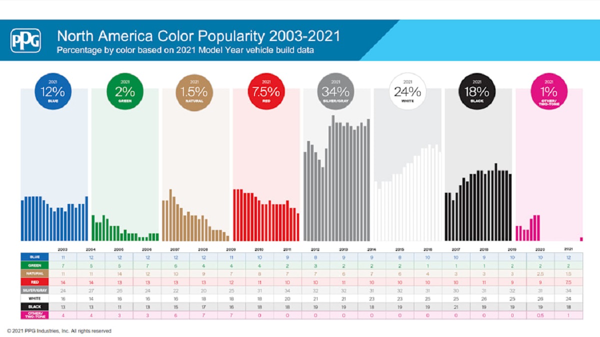 تنها کافی است در یک پارکینگ شلوغ نگاهی به ماشین ها بیندازید و یا سری به یکی از وبسایت های فروشنده خودرو بزنید تا دست تان بیاید که کدام رنگ ها محبوب تر هستند. جواب، برای کسانی که به رنگ علاقه دارند، ناامید کننده است. گزارش سالانه PPG از محبوبیت رنگ ماشین ها را در این نمودار مشاهده می کنید.