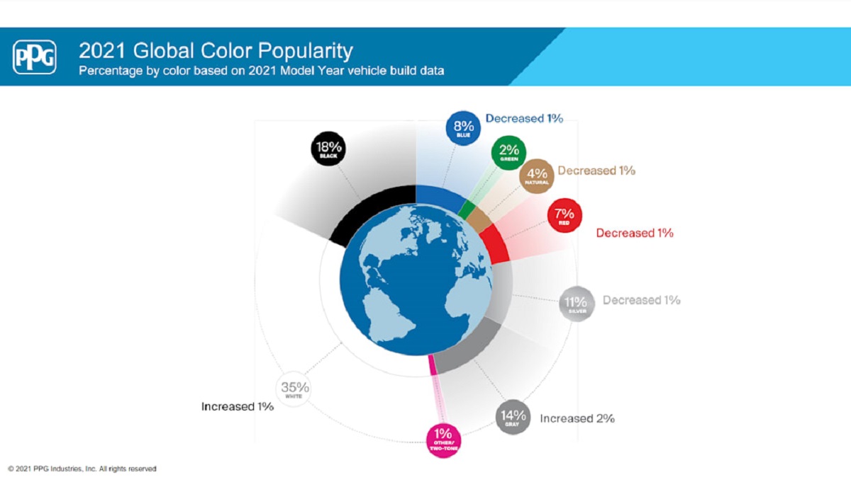 به گزارش سایت طلا، همچنان رنگ سفید در صدر رنگ های محبوب افرادی است که ماشین نو می خرند. شرکت آمریکایی PPG که در حوزه رنگ، رزین های صنعتی و مواد شیمیایی فعالیت دارد عنوان می کند که ۳۵ درصد خریداران سراسر جهان این رنگ را انتخاب می کنند که از مجموع رنگ های آبی، سبز، طلایی، بژ و قرمز بیشتر است. طوسی، نقره ای و مشکی هم در خیلی نقاط جهان بالاتر از بسیاری از رنگ های واقعی قرار می گیرند.