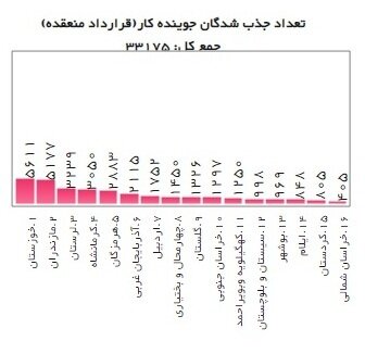 در بین استانهای کشور، استان خوزستان بیشترین تعداد داوطلب،کارفرما و قرارداد منعقده را به خود اختصاص داده و کمترین میزان استقبال متعلق به استان خراسان شمالی بوده است.