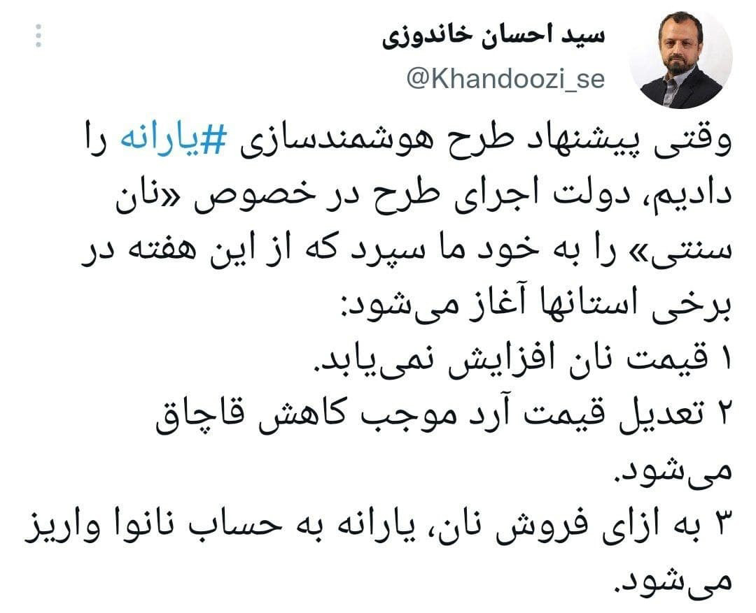 "وقتی پیشنهاد طرح هوشمندسازی #یارانه را دادیم، دولت اجرای طرح در خصوص «نان سنتی» را به خود ما سپرد که از این هفته در برخی استانها آغاز میشود: