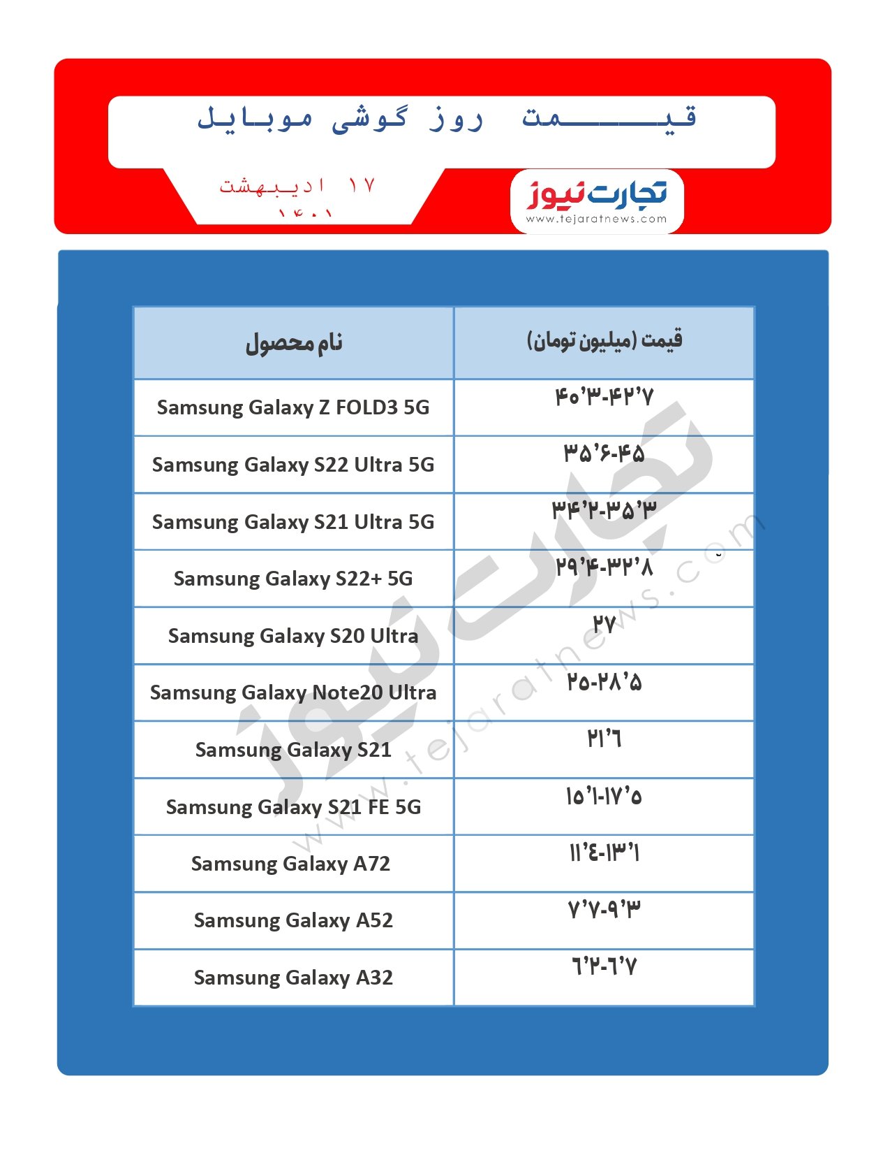 قیمت انواع گوشی‌های موبایل سامسونگ، اپل و شیائومی را در بازار امروز شنبه ۱۷ اردیبهشت ۱۴۰۱، مشاهده می‌کنید.