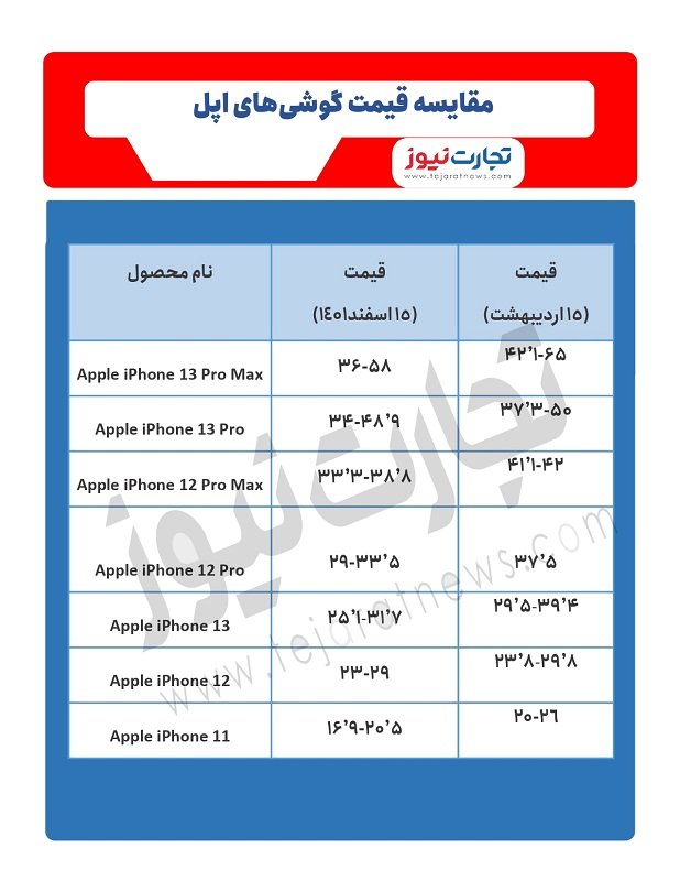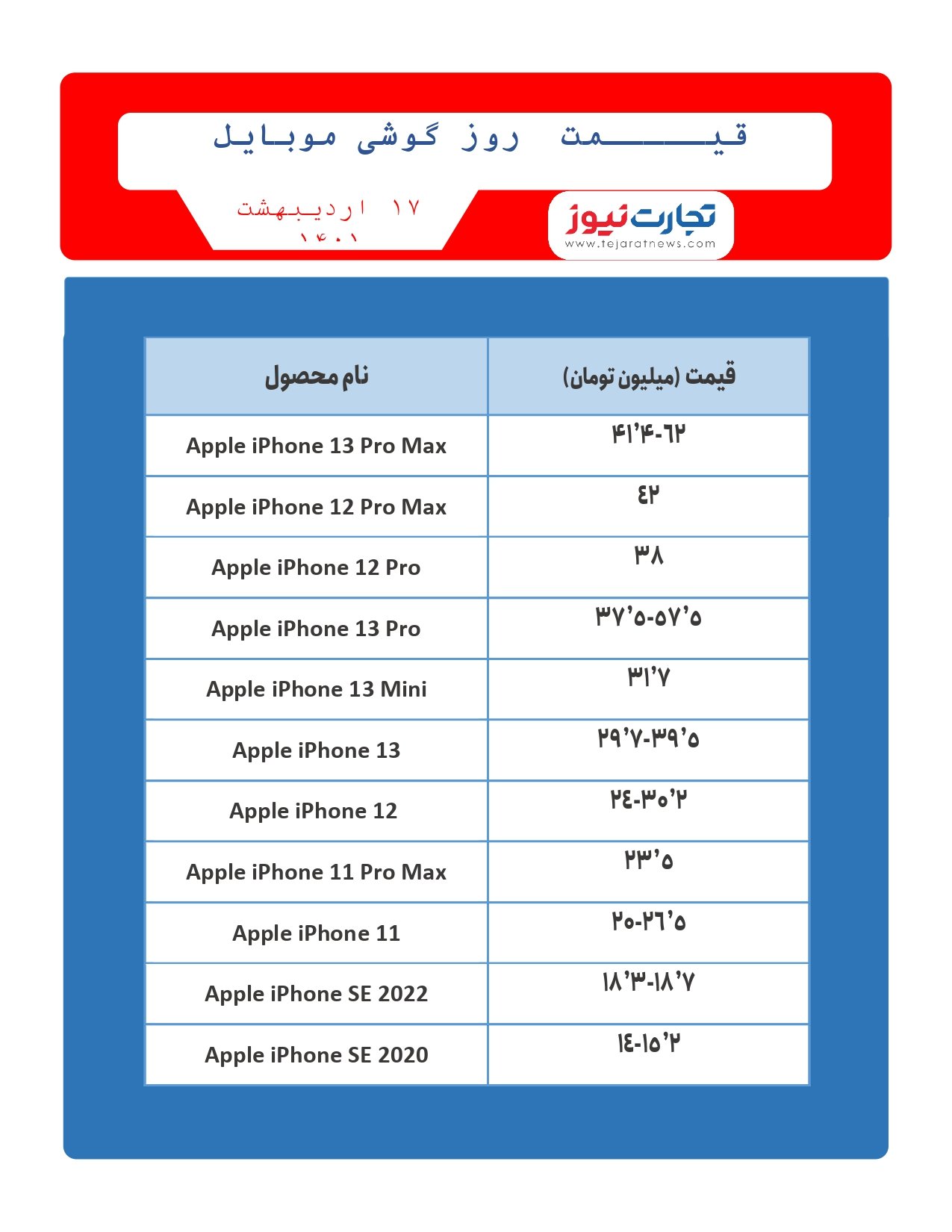آیفون ۱۳ پرومکس نیز که در در اسفندماه در کمترین قیمت خود ۳۶ میلیون تومان بوده است امروز ۱۵ اردیبهشت‌ماه ۴۲ میلیون و ۱۰۰ هزار تومان اعلام شده است.