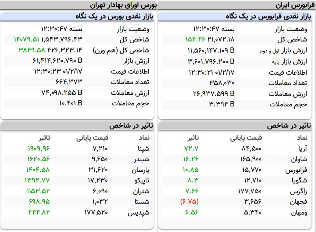 نمادهای پلیمر آریا ساسول (آریا)، پالایش نفت لاوان (شاوان)، فرابورس ایران (فرابورس)، پتروشیمی تندگویان (شگویا)، پتروشیمی زاگرس (زاگرس) و گروه توسعه ملی مهر آیندگان (ومهان) با تاثیر مثبت بر شاخص فرابورس همراه بودند.