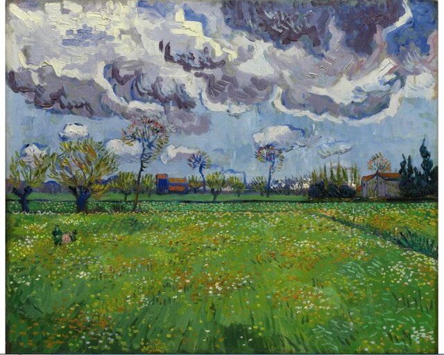 «ونگوگ» نقاشی «منظره زیر آسمان توفانی» را در «آرل» پس از بریده شدن گوشش و فقط چند هفته قبل از خروج از آسایشگاه خلق کرد. چمنزار مملو از گلهای بهاری است و در گوشهای از نقاشی یک زوج زیر آسمان به تصویر کشیده شدهاند. این نقاشی در سال ۲۰۱۵ به قیمت ۵۴ میلیون دلار به فروش رسید.