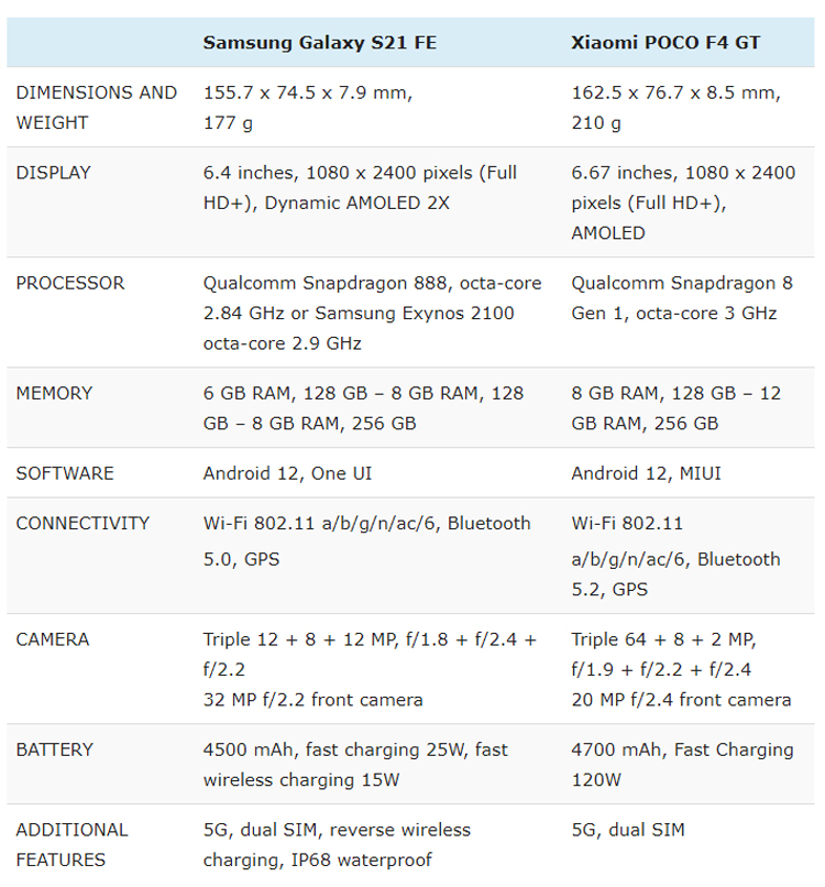 مهمترین نقطه قوت POCO F4 GT استفاده از بهترین چیپست شرکت معتبر کوالکام در سال ۲۰۲۲ است. این گوشی از پردازنده هشت هستهای اسنپدراگون ۸ نسل ۱ با فرآیند ۴ نانومتر و حداکثر فرکانس ۳ گیگاهرتز بهره میبرد. این پردازنده با حداکثر ۱۲ گیگابایت رم و حداکثر ۲۵۶ گیگابایت حافظه داخلی UFS 3.1 جفت شده است. درنقطه مقابل گوشی Samsung Galaxy S21 FE از یک چیپست سطح پایین تر، یعنی Snapdragon 888، با فرکانس ۲.۸۴ گیگاهرتز استفاده میکند. البته توجه داشته باشید که در برخی از بازارها، این گوشی با پردازنده Exynos 2100 ارائه میشود. این پردازنده با تنها ۸ گیگابایت رم و حداکثر ۲۵۶ گیگابایت حافظه داخلی جفت میشود. اگرچه گوشی گلکسی S21 FE مشخصات سختافزاری پایینتری دارد، اما توجه داشته باشید که تنها در زمان اجرای سنگینترین برنامهها متوجه تفاوت این دو گوشی میشوید. به هر حال هر دو در کلاس پرچمدار هستند. سیستم عامل نصب شده بر روی این دو گوشی اندروید ۱۲ با رابط کاربری سفارشی شده میباشد.