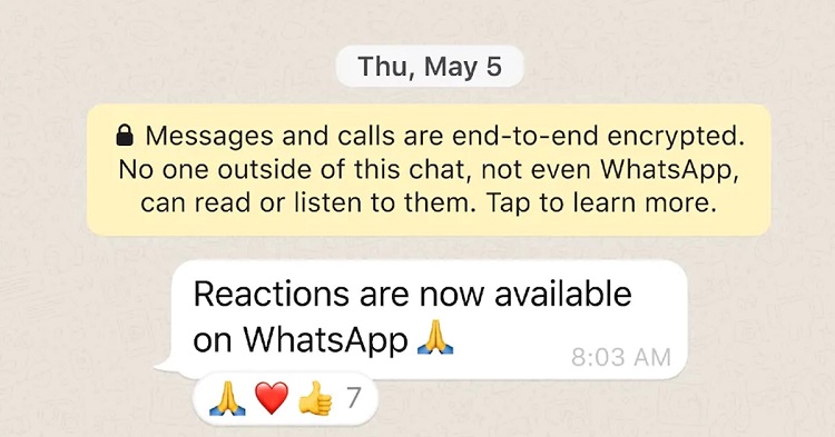 فرارو نوشت:ویژگی ارسال واکنش با استفاده از ایموجی، اکنون با چند ایموجی در دسترس قرار گرفته است و به گفته واتساپ در آینده از همه ایموجیها مانند عشق، خنده، تعجب، غم و تشکر و رنگ پوستهای مختلف پشتیبانی خواهد کرد. قابلیت واکنش واتساپ به کاربران این امکان را میدهد تا بدون شلوغ شدن چت گروهی و ارسال پیام اضافی، به یک پیام در گروه واکنش نشان دهند. کاربران برای واکنش نشان دادن به یک پیام، باید آن پیام را به مدت بیشتری فشار داده و سپس روی ایموجی نمایش داده شده ضربه بزنند.