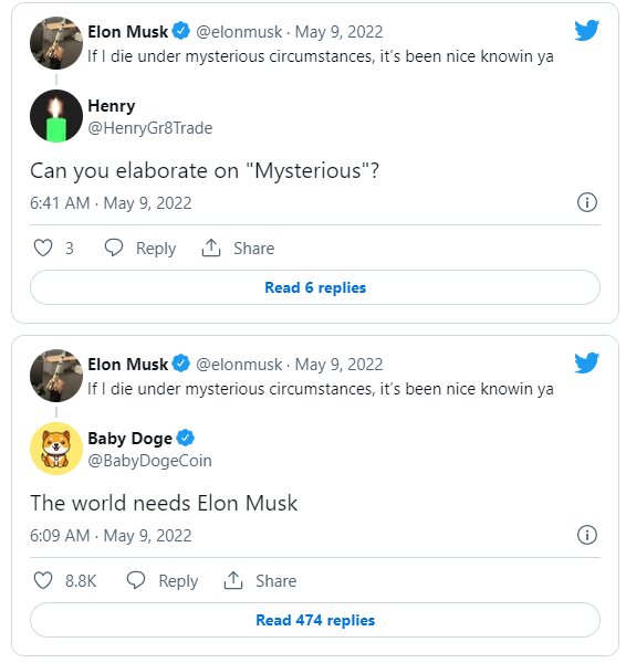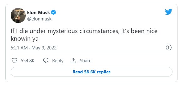 ایلان ماسک، صاحب کنونی توییتر امروز نهم مه توییتی منتشر کرد که به نظر میرسید پستی در مورد مرگش باشد. این توییت واکنشهای زیادی را برانگیخت. ماسک که به توییتهای عجیبش معروف است نوشت: "اگر من تحت شرایطی مرموز مُردم، از آشنایی با شما خوشحال شدم."