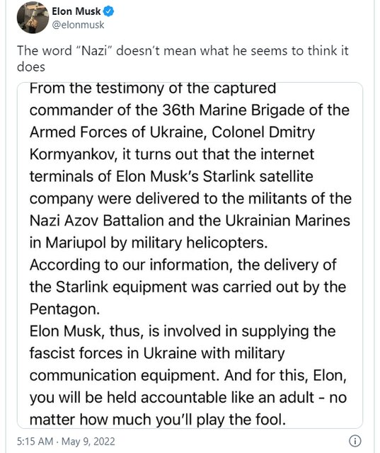 او این توییت را دو ساعت پس از توییت دیگری منتشر کرد که به نظر میرسید یک بیانیهی مطبوعاتی باشد که در آن اعلام شده ایلان ماسک با تجهیزات ماهوارهای استارلینک در حال کمک به نیرویهای اوکراینی است. در این بیانیه آمده که ماسک در قبال اقدامات خود "مسئول" خواهد بود.