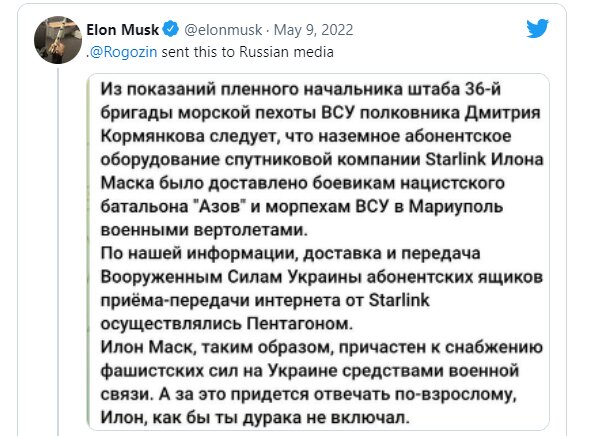 توییت ایلان ماسک تصویری از یک بیانیه به زبان روسی است که به گفتهی ماسک، یک اکانت رسمی توییتر به نام "Rogozin" که براساس برخی گزارشها متعلق به دیمیتری اولگوویچ روگوزین مدیر آژانس فضایی روسیه موسوم به روسکاسموس است، برای رسانههای روسیه ارسال شده است. ماسک در ادامه متنی که به نظر میرسد ترجمهی این بیانیه باشد را در صفحه توییتر خود منتشر کرد. در این بیانیه آمده که ایلان ماسک با بالگردهای نظامی پایانههای اینترنتی استارلینک را به اوکراین رسانده است.