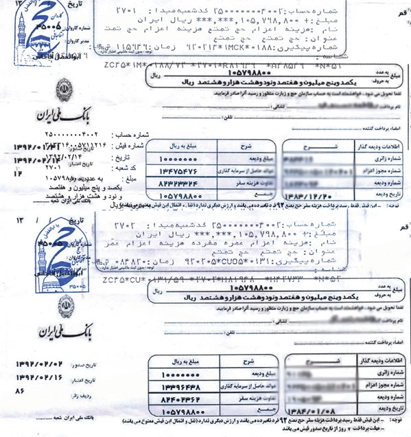 فیش‌های حج تمتع سال‌های ۸۱ و ۸۴ که در آن سال‌ها سپرده اولیه یک میلیون تومان بود