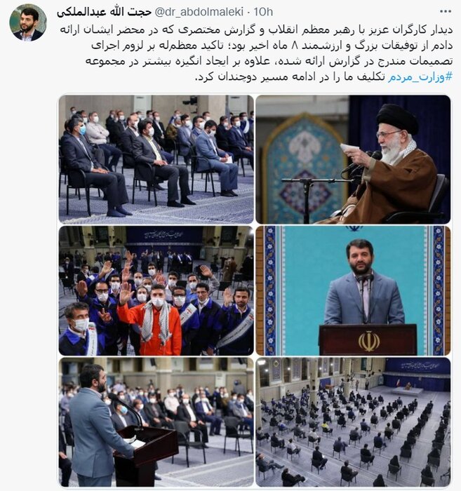 «حجت الله عبدالملکی » روز چهارشنبه در توئیت نوشت: «دیدار کارگران با رهبر معظم انقلاب و گزارش مختصری که در محضر ایشان ارائه دادم از توفیقات بزرگ و ارزشمند ۸ ماه اخیر بود؛ تاکید معظمله بر لزوم اجرای تصمیمات مندرج در گزارش ارائه شده، علاوه بر ایجاد انگیزه بیشتر در مجموعه وزارت کار تکلیف ما را در ادامه مسیر دوچندان کرد.»