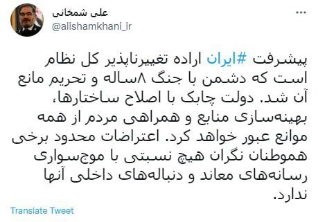 به گزارش سایت طلا ، علی شمخانی در توییتی نوشت: پیشرفت ایران اراده تغییرناپذیر کل نظام است که دشمن با جنگ ۸ساله و تحریم مانع آن شد. دولت چابک با اصلاح ساختارها، بهینهسازی منابع و همراهی مردم از همه موانع عبور خواهد کرد. اعتراضات محدود برخی هموطنان نگران، هیچ نسبتی با موجسواری رسانههای معاند و دنبالههای داخلی آنها ندارد.