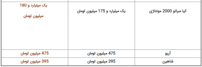 | پژو 2008 | یک میلیارد و 345 میلیون تومان | یک میلیارد و 350 میلیون تومان |