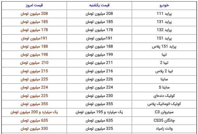 | خودرو | قیمت یکشنبه | قیمت امروز |