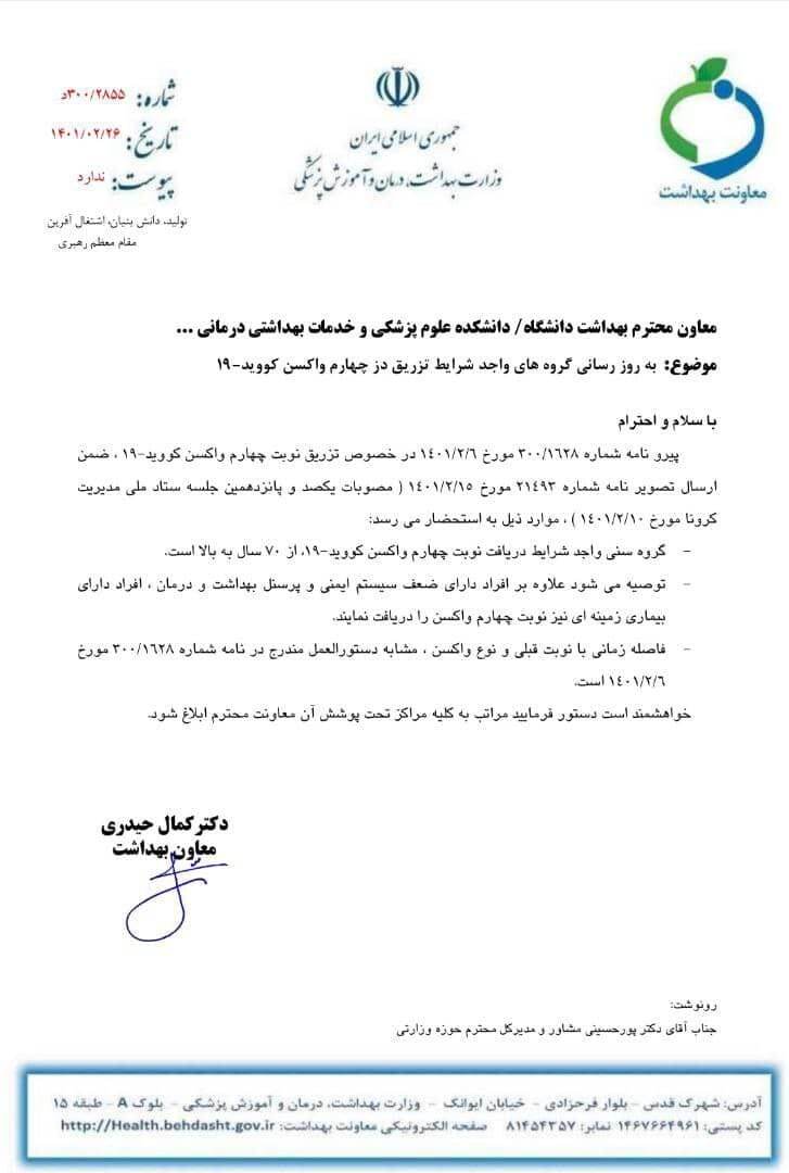 پیرو نامه شماره ۳۰۰/۱۶۲۸ مورخ ۶-۲-۱۴۰۱ در خصوص تزریق نوبت چهارم واکسن کووید ۱۹، ضمن ارسال تصویر نامه شماره ۲۱۴۹۳ مورخ ۱۵-۰۲-۱۴۰۱ (مصوبات یکصد و پانزدهمین جلسه ستاد ملی مدیریت کرونا مورخ ۱۰-۰۲-۱۴۰۱)، موارد ذیل به استحضار می‌رسد:
