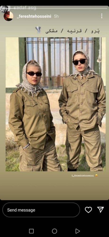 فرشته حسینی، عکسی از خود را در کنار صدف عسگری، با پوششی متفاوت، در اینستاگرامش به اشتراک گذاشت. این دو بازیگر، در «دسته دختران» که فیلمی دفاع مقدسی بود، در نقش دو رزمنده خرمشهری ظاهر شده بودند.