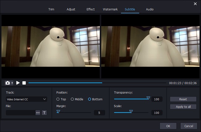 با فشردن دکمه ویرایش (Edit) در تابلوی سمت چپ، به ویرایشگر ویدئوی نرم افزار Joyoshare VidiKit دسترسی پیدا می کنید. بعدا وارد نوار زیرنویس (Subtitle) شوید. با رفتن به کادر پیگیری (Track) می توانید فایل زیرنویس به هم پیوسته با فیلم را پیدا کنید یا اینکه به کادر فایل (File) بروید و دکمه کلیک … کنید تا فایل زیرنویسی که دانلود کرده اید را وارد کنید. می توانید با کلیک روی آیکون T خصوصیت های ظاهری زیرنویس از موقعیت، شفافیت تا فونت و سایر بخش ها را کاملا شخصی سازی کنید.