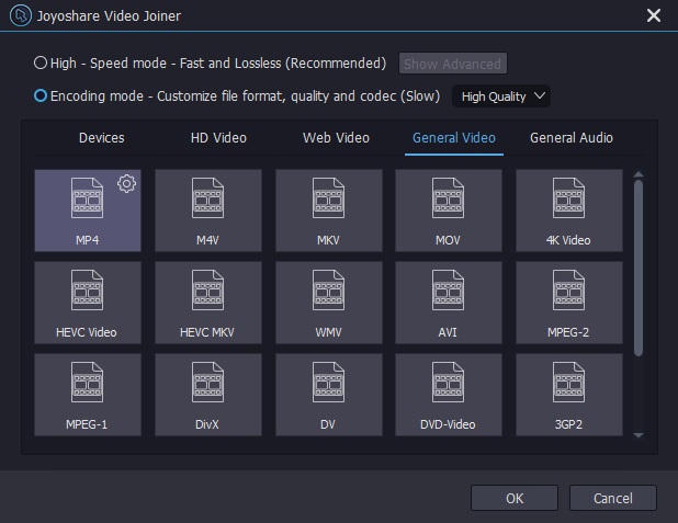 سپس، روی دکمه فرمت (Format) که در گوشه پایین سمت راست قرار دارد، کلیک کنید. دو حالت برای ترکیب فایل ها وجود دارد که عبارتند از: حالت پرسرعت (high-speed) و حالت کد کردن (encoding). حالت اول اجازه می دهد که فیلم ها را بدون هر گونه افت کیفیتی برش داده و با هم ترکیب کنید. اما برای اضافه کردن زیرنویس به فیلم گزینه دو را پیشنهاد می دهیم.
