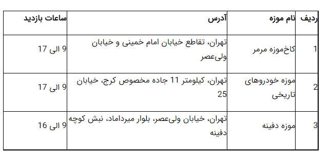 | 2 | کاخموزه نیاوران (بههمراه 7 موزه داخل این مجموعه) | تهران میدان شهید باهنر (نیاوران) | 9 الی 19 |