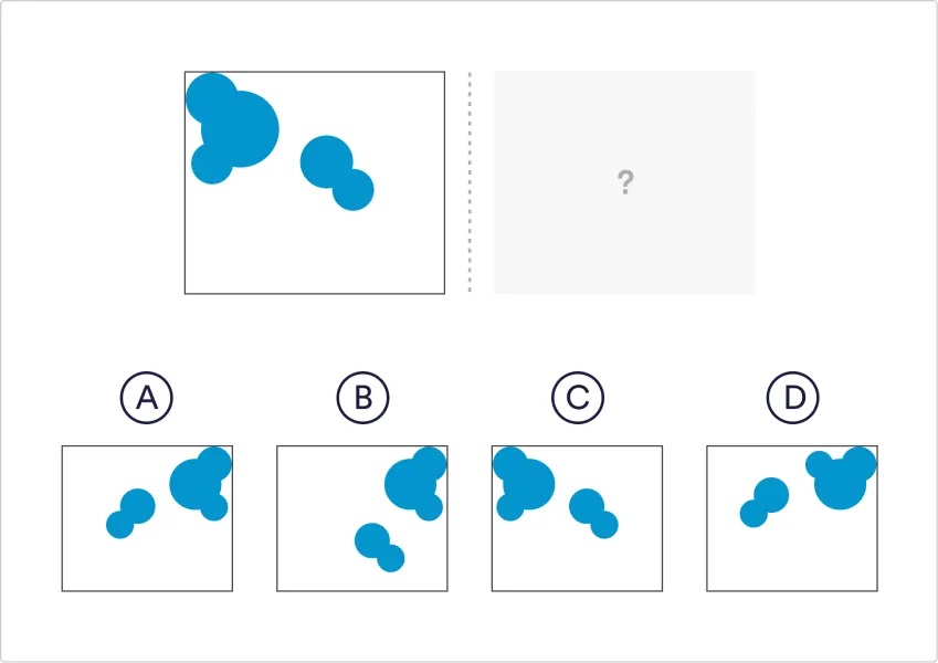 ساده ترین راه این است که تا حد امکان نزدیک به خط آینه شروع کنید و دورتر کار کنید. در این حالت می توانید ببینید که دو دایره کمی روی هم قرار دارند، بنابراین پاسخ باید A یا D باشد. اگر موقعیت دایره های بیرونی را ارزیابی کنید، می توانید ببینید که پاسخ A است.