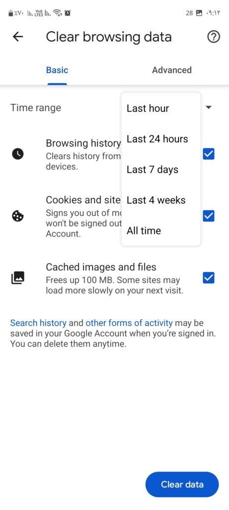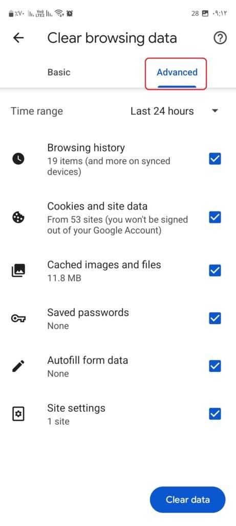 گوگل کروم همچنین گزینههای ابتدایی و پیشرفتهای را برای پاک کردن حافظهی کش و کوکی در اختیار شما قرار میدهد. در بخش پیشرفته امکان پاک کردن گزینههایی نظیر تاریخچهی وبگردی، دیتا و کوکی ۵۰ سایت، کش تصاویر و فایلها، رمزهای عبور، اطلاعاتی که به صورت خودکار در کادرهای مختلف پر میشوند نظیر رمز عبور و تنظیمات مختلفی که برای یک سایت اعمال کردید، به شما داده خواهد شد.