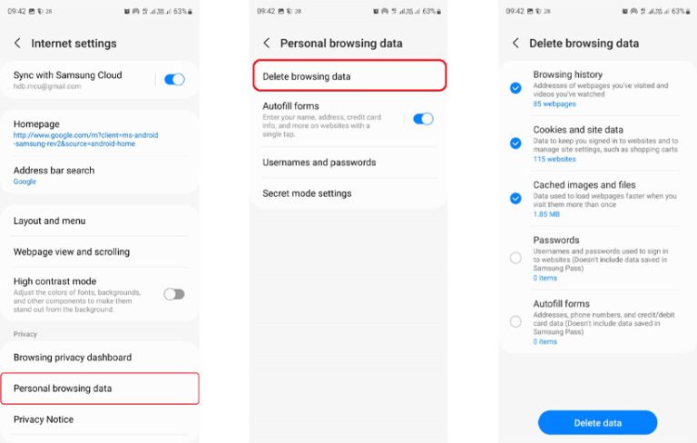 پاک کردن حافظهی کش و کوکی در سامسونگ اینترنت