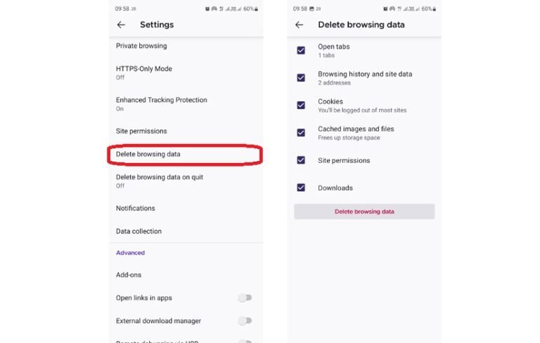 در مرورگر فایرفاکس هم پاک کردن حافظهی کش و کوکی بسیار ساده است. به این صورت که باید روی آیکن سه نقطه در سمت راست پایین صفحه کلید کنید (بسته به نوع چینش منوها، محل این آیکن میتواند متفاوت باشد). و سپس وارد تنظیمات یا همان Settings شوید. در این قسمت هم به پایین اسکرول کنید تا بخش Delete browsing data دیده شود. با کلیک روی این گزینه میتوانید تاریخچهی جستوجو، کوکی، کش، مجوزها، دانلودها و… را پاک کنید.