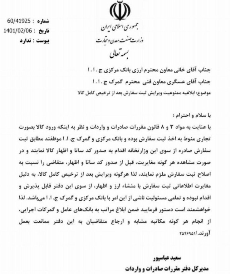 بر اساس اعلام دفتر مقررات صادرات و واردات وزارت صمت، ویرایش ثبت سفارش بعد از ترخیص کامل کالا امکانپذیر نیست.