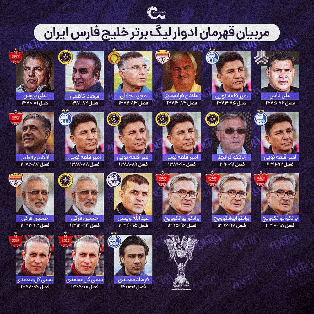 یحیی گل محمدی و حسین فرکی دو مربی هستند که موفق شدند دوبار پیاپی قهرمانی لیگ برتر را از آن خود کنند. حسین فرکی با سپاهان و فولاد در لیگ های سیزدهم و چهاردهم و همچنین یحیی گل محمدی با پرسپولیس در لیگ های نوزدهم و بیستم به مقام قهرمانی رسیدند. پرسپولیس با گل محمدی در لیگ بیست و یکم هم در کورس قهرمانی با استقلال بود اما چند هفته پایانی این تیم نتایج خوبی کسب نکرد تا استقلال بعد از ۹ سال به عنوان قهرمانی برسد.