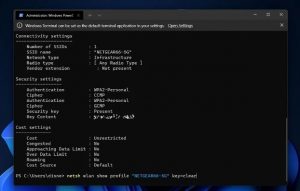 پس از پیدا کردن نام شبکهای که قصد پیدا کردن رمز عبور آن را دارید، عبارت netsh wlan show profile «(Wi-Fi network name)» key=clear را تایپ کنید که البته در قسمت ” (Wi-Fi network name) میبایست نام شبکه وایفای مدنظر خود را تایپ کنید. پس از وارد کردن نام شبکه، دکمه Enter را بزنید