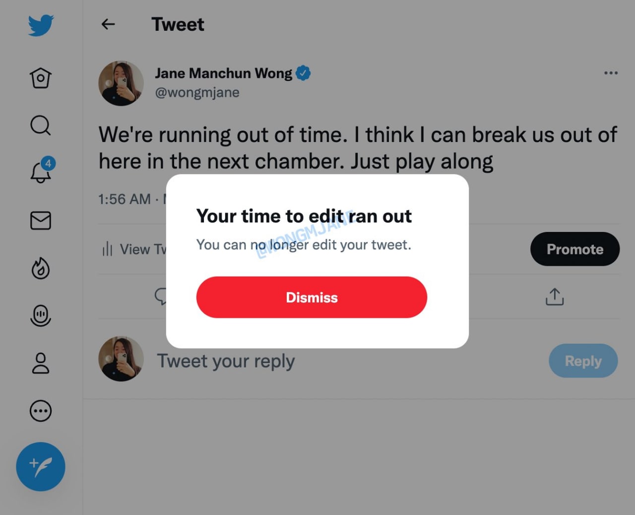 «جین مانچون وانگ» مهندس معکوس شناخته شده، در توییت جدید خود، تصویری از این پیغام را به اشتراک گذاشت که در آن توییتر به کاربر اطلاع میدهد، «زمان ویرایش تمام شده است». با این وجود کاربر دیگر قادر نخواهد بود توییت خود را ویرایش کند. این ویژگی هم اکنون در مرحله توسعه است و احتمالا همزمان با دکمه ویرایش، در دسترس قرار خواهد گرفت.