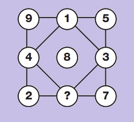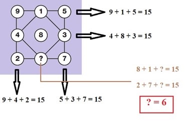 می بینیم که مجموع اعدادی که به عنوان سطر و ستون در نظر می گیریم برابر با ۱۵ است. با پیدا کردن عددی که سطر و ستون حاوی عدد گم شده را به ۱۵ تبدیل می کند، می توانیم سوال خود را حل کنیم. جواب ۶ است.