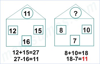 در این سوال؛ اعداد تعبیه شده در پنجره را با اضافه کردن آنها جمع آوری می کنیم۲۷= ۱۲ + ۱۵ ، مرحله بعدی؛ عدد داخل در را از این عددی که پیدا می کنیم کم می کنیم۱۱ = ۲۷ - ۱۶ ، می بینیم که در سوال ما عدد ۱۱ در پشت بام قرار گرفته است. پاسخ ۱۱ است.