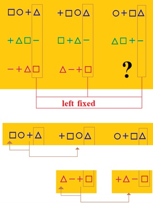 همانطور که در اینجا و در تصویر اشاره کردیم آخرین شکل ثابت نگه داشته می شود. سه شکل باقیمانده یکی پس از دیگری از راست به چپ متناوب می شوند. پاسخ؛ برای آخرین بخش از آخرین خط که با رنگ قرمز مشخص شده است.
