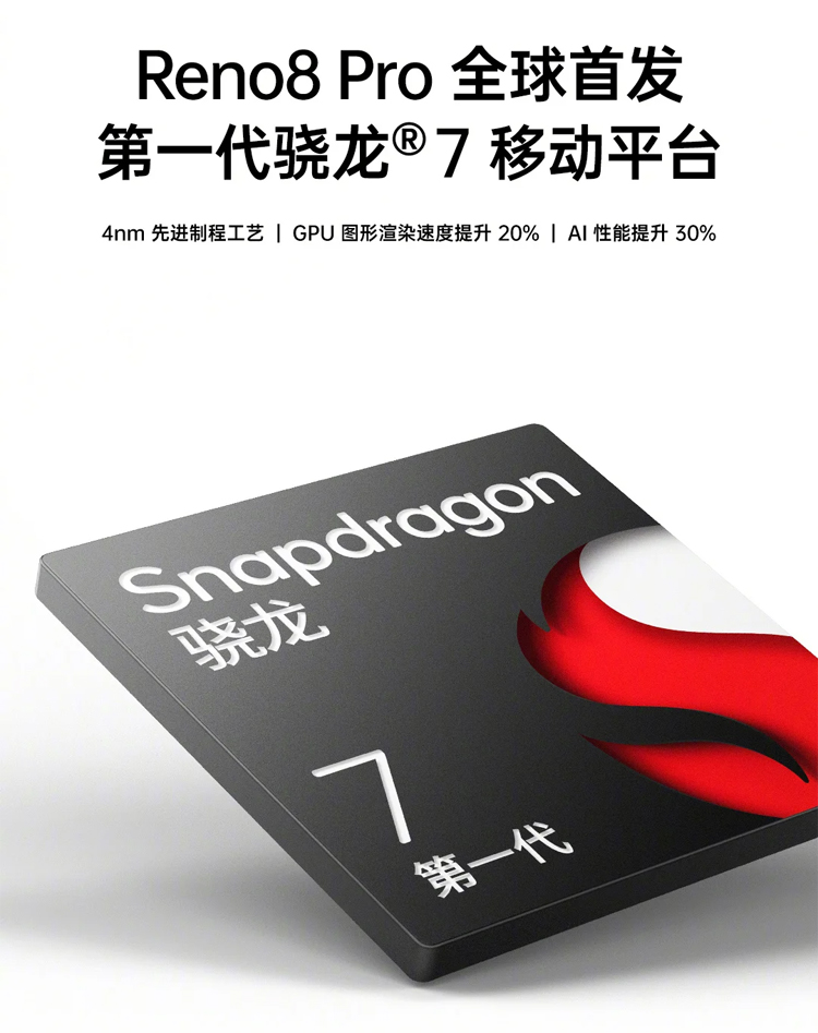 این خبر در حساب کاربری رسمی رسانههای اجتماعی این برند از جمله شبکه اجتماعی چینی Weibo آمده است. این پوستر نشان میدهد که Oppo Reno 8 Pro دارای تراشه اسنپدراگون ۷ نسل ۱ خواهد بود که بر روی فرآیند تولید ۴ نانومتری سامسونگ ساخته شده است. این تراشه تا ۲۰ درصد عملکرد پردازنده گرافیکی بالاتر و تا ۳۰ درصد عملکرد پردازش هوش مصنوعی سریعتر نسبت به نسل قبلی دارد.