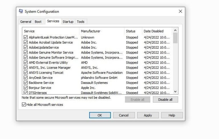 گزینه‌ی Hide all Microsoft services box را بزنید تا سرویس‌های مربوط به سیستمتان از لیست نشان داده شده محو شوند.